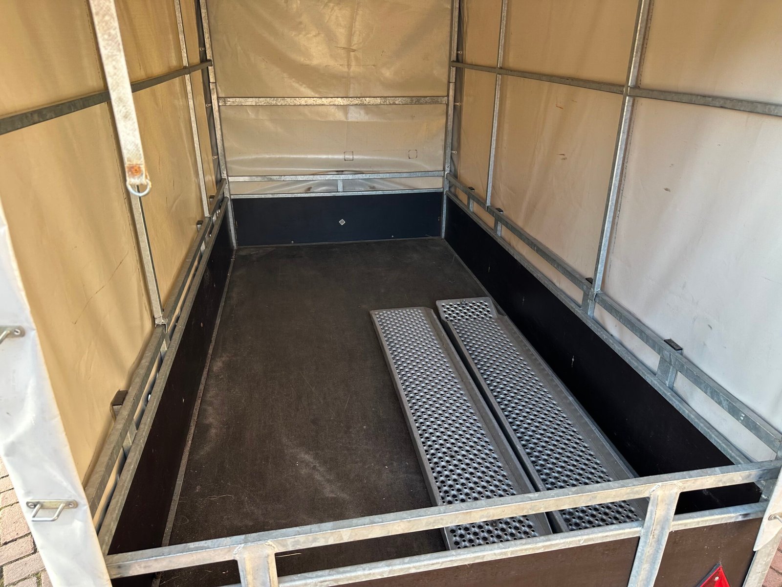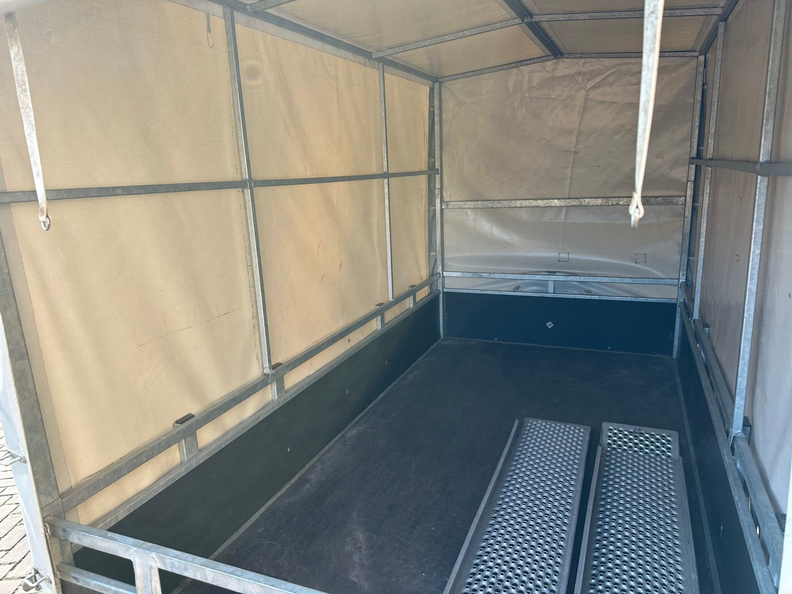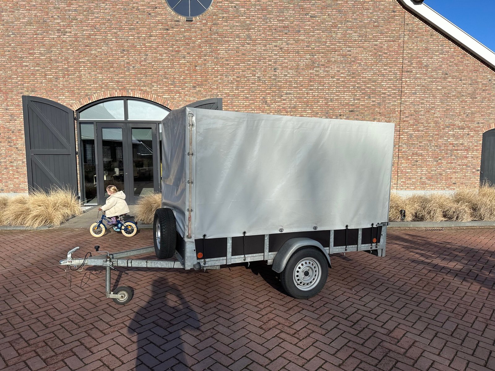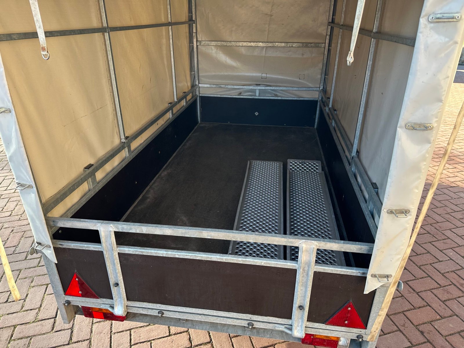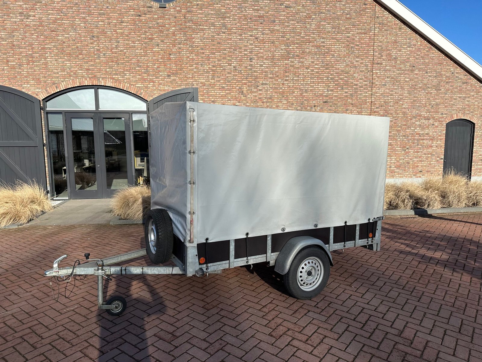 Huif aanhanger – 250 bij 130cm – met oprijplaten, steunpoot en reservewiel
