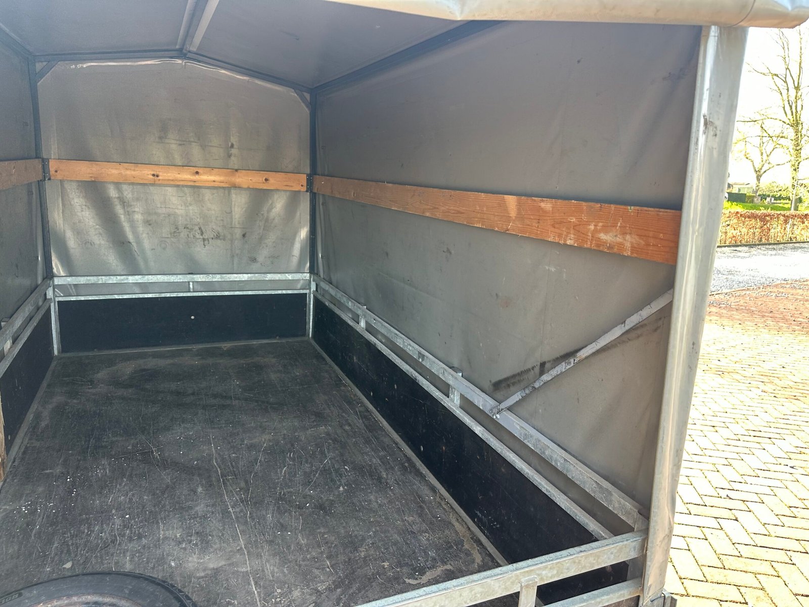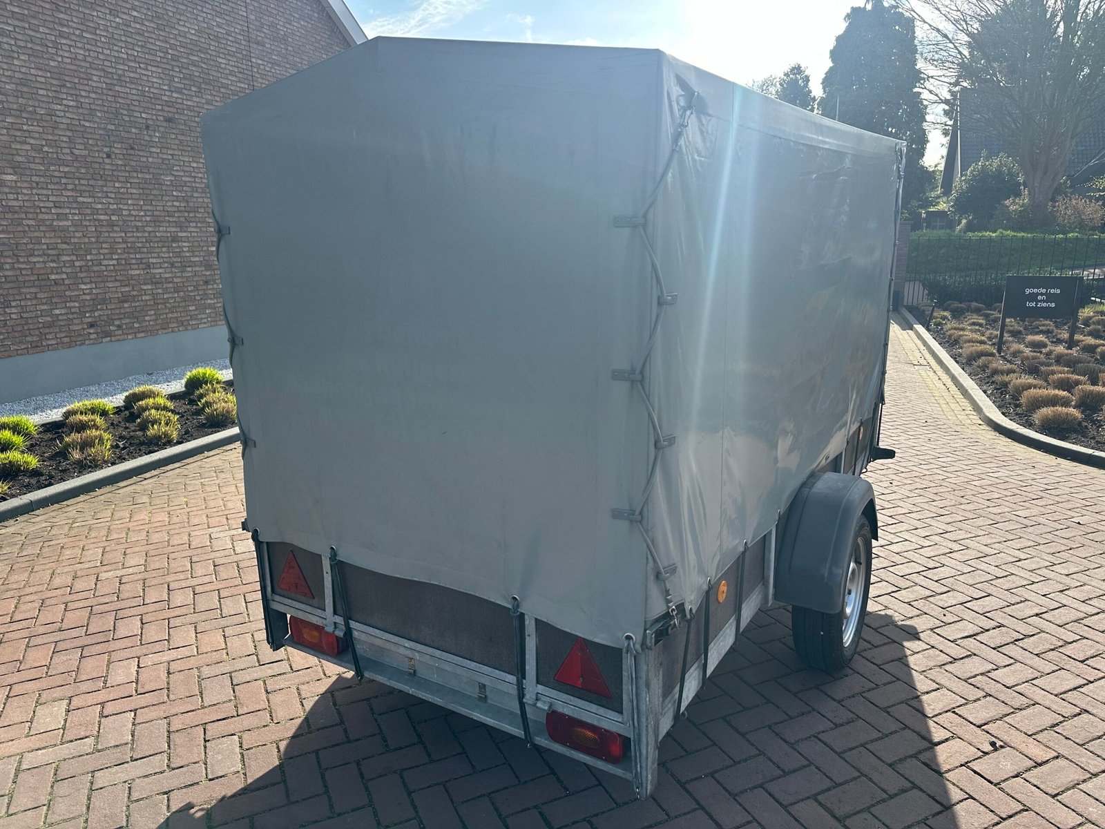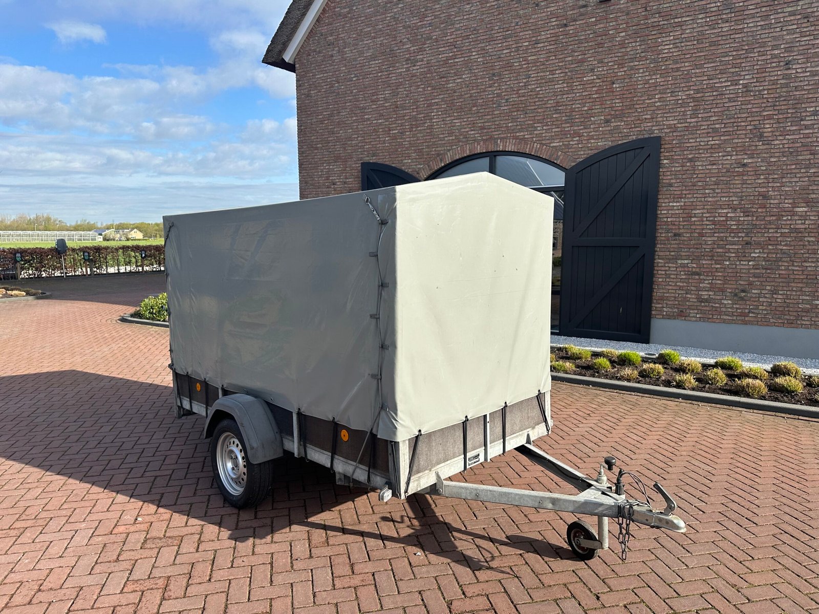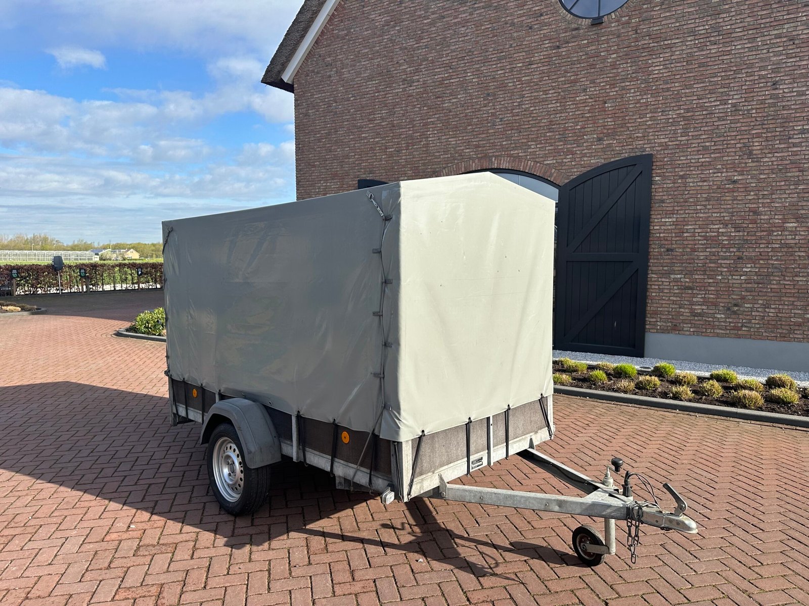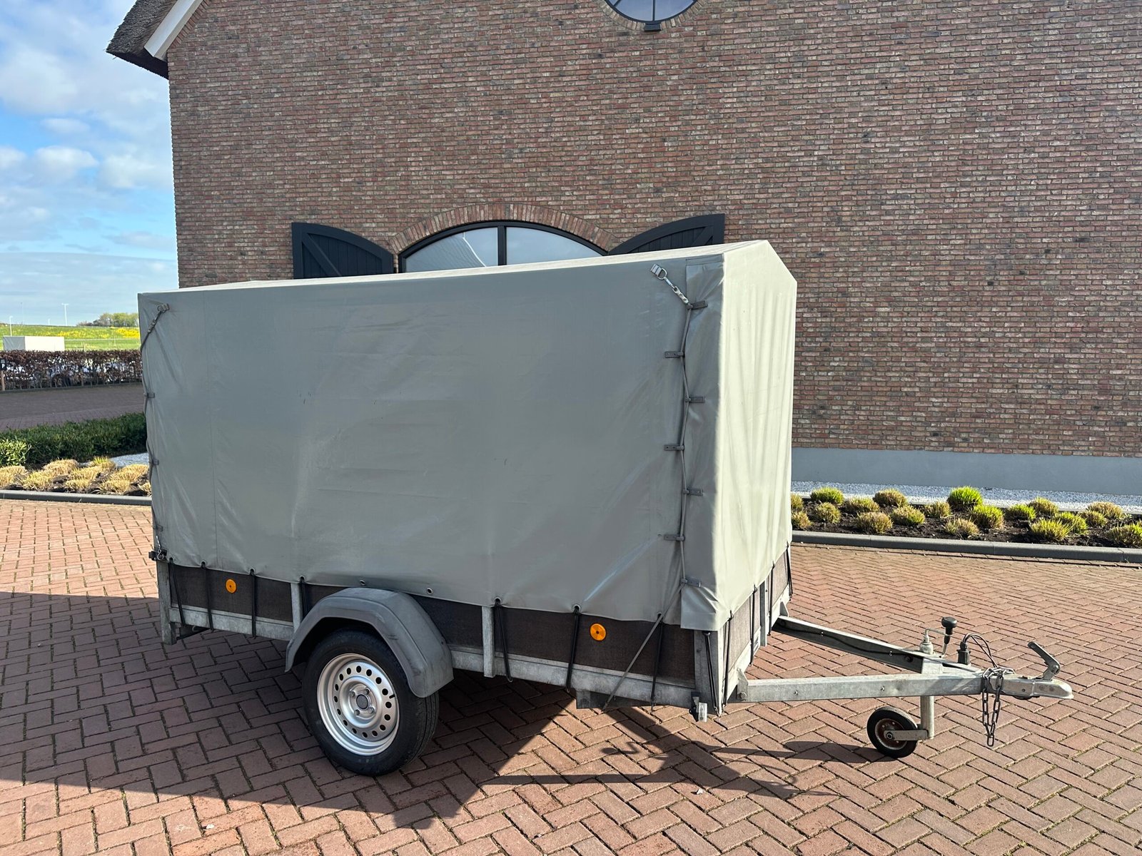 Stevige aanhanger voorzien van een praktische huif. De huif heeft een schuin dak wat voorkomt dat er water op get zeil blijft liggen. Deze aanhanger is ideaal voor het veilig en droog transporteren van diverse goederen. De aanhanger is ongeremd en goed onderhouden.