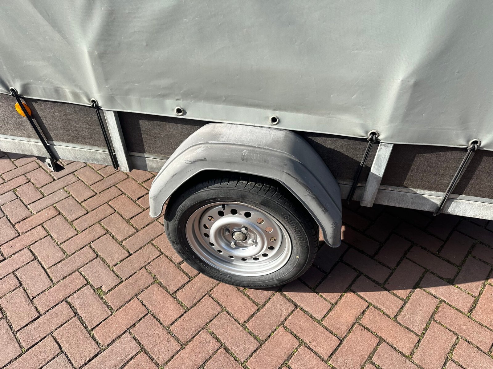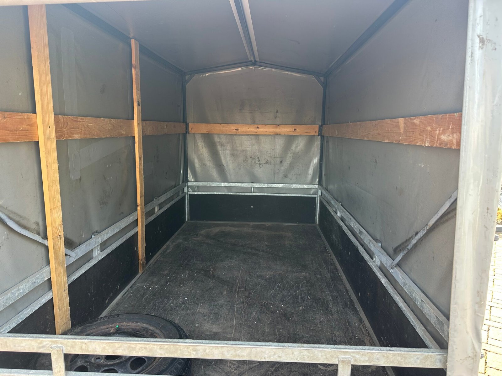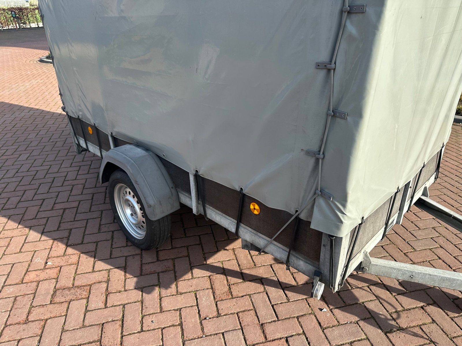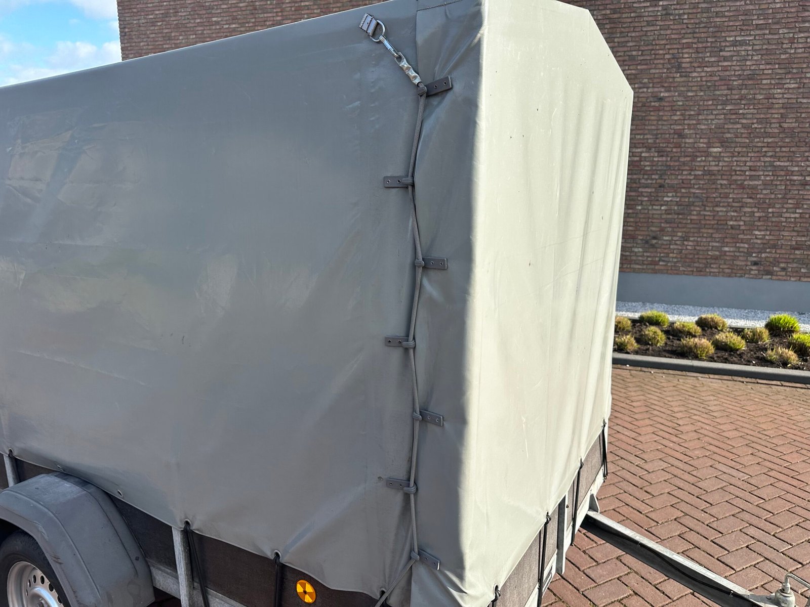 Stevige aanhanger voorzien van een praktische huif. De huif heeft een schuin dak wat voorkomt dat er water op get zeil blijft liggen. Deze aanhanger is ideaal voor het veilig en droog transporteren van diverse goederen. De aanhanger is ongeremd en goed onderhouden.