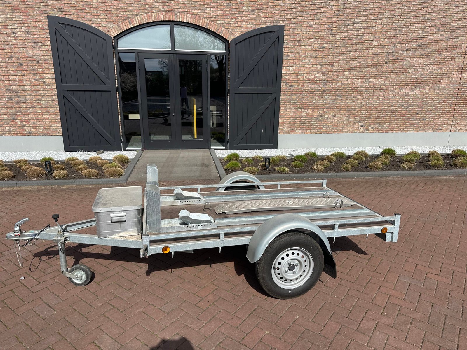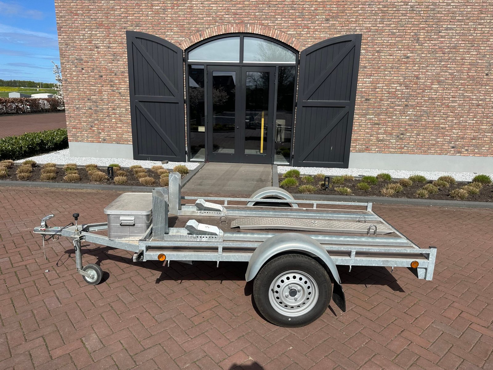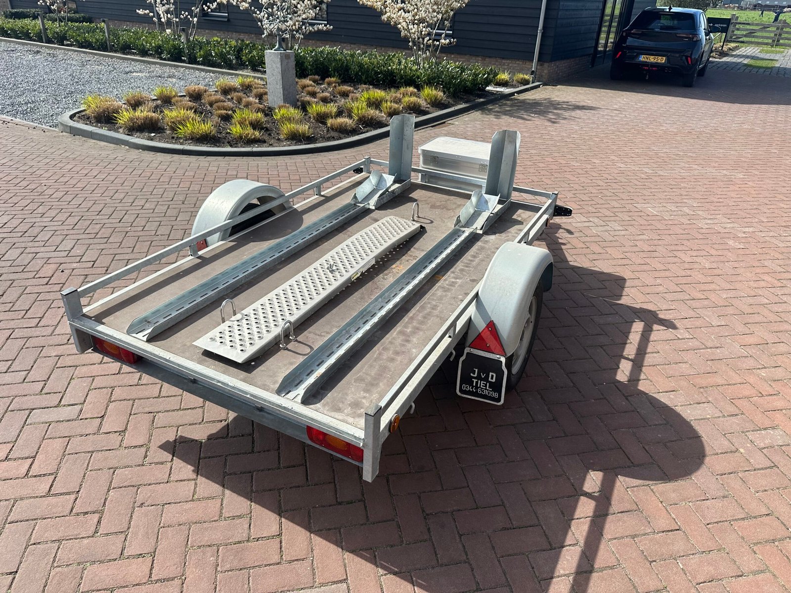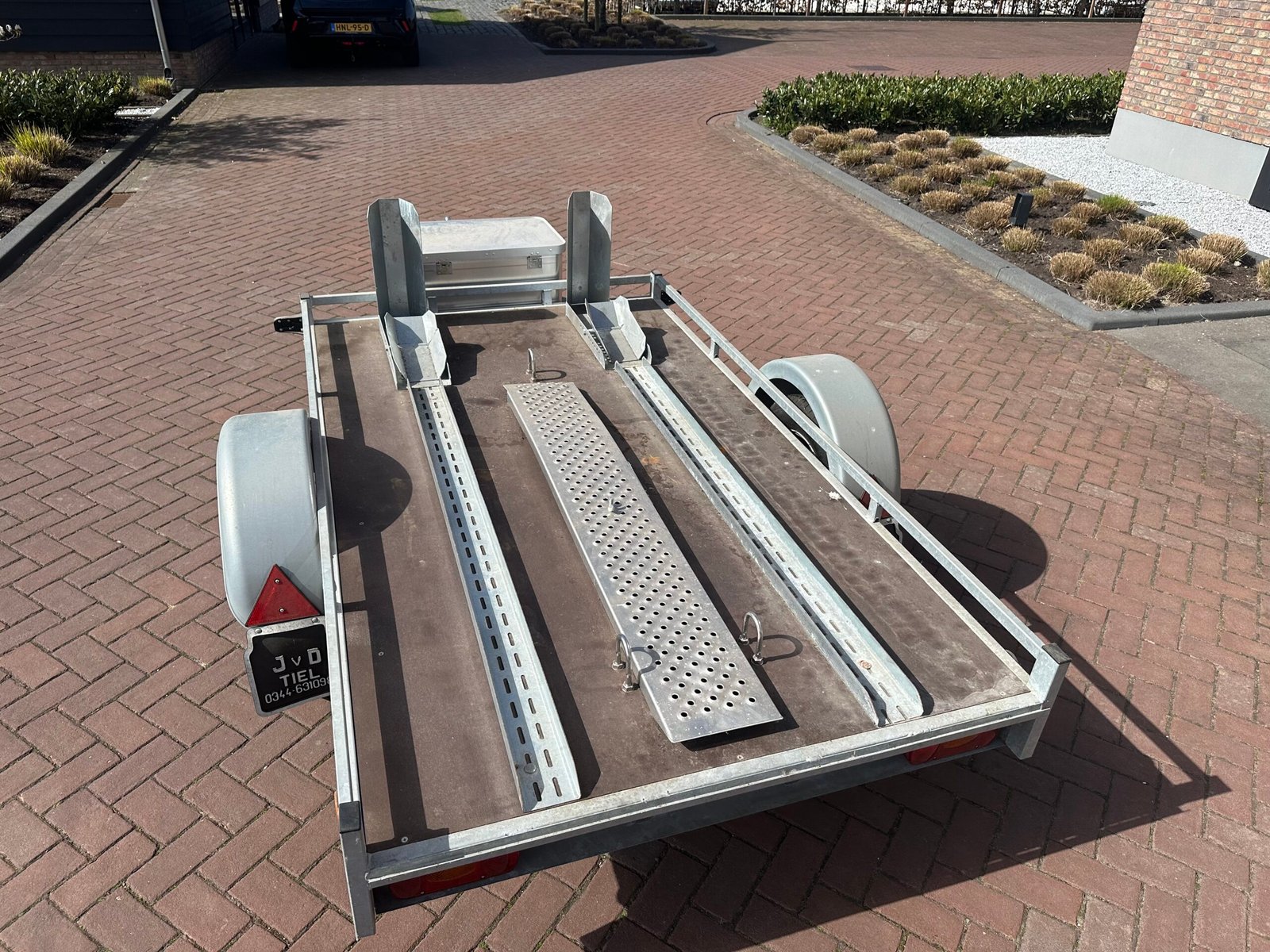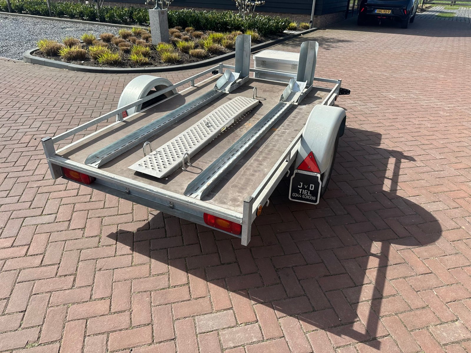 Zeer nette en complete scooter- of motortrailer. Ideaal voor het vervoeren van één of twee scooters/motoren. De trailer is voorzien van een stevige bodem, oprijplaat en opbergkist. Perfect voor vakantie tripjes of normaal transport.